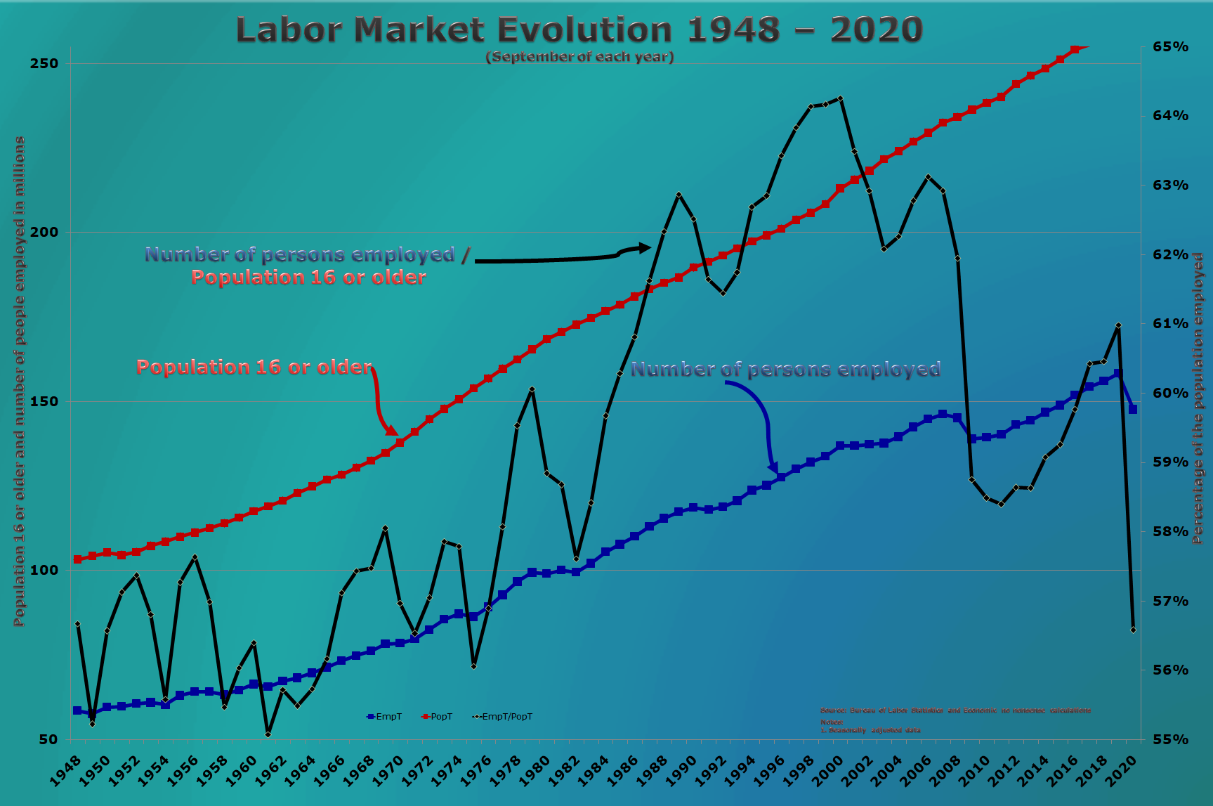 Table 1 compares the labor statistics between 2019 and 2020 for the month of September on a seasonally adjusted basis. The population under scrutiny, that from which the labor force derives, corresponds to people at least sixteen years old or older. This group increased by 1.3 million people during the year at an annual rate of 0.48%.
