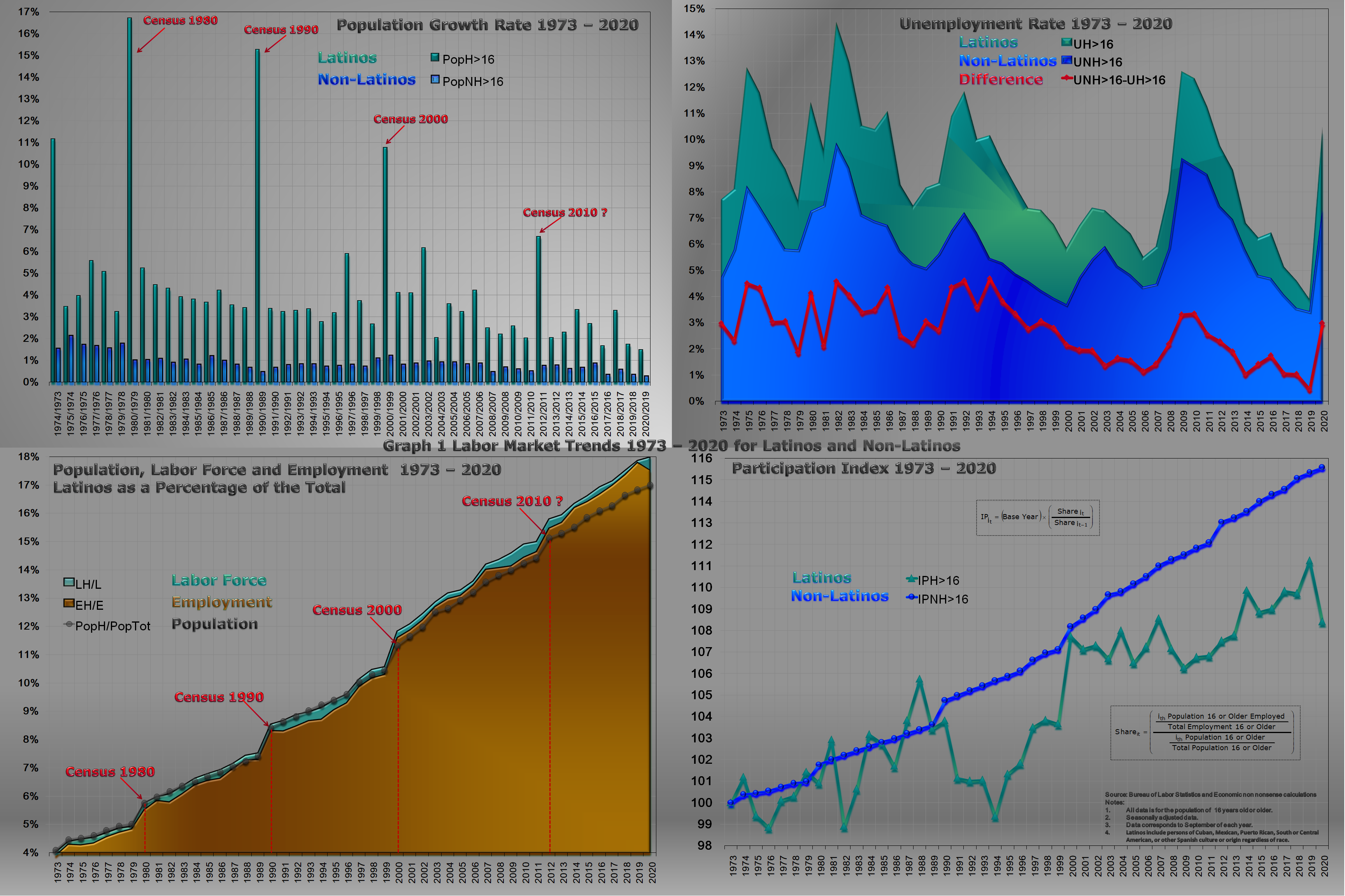 The top-left panel of Graph 1 shows the annual growth rate for the Latino population conveyed by the green bars and by the blue ones for the Non-Latino. While the average annual rate of growth between 1973 and 2020 for Latinos was 4.32% the one for Non-Latinos was 0.91%, moving to represent 17% of the total in 2020 from 4.1% in 1973, undeniably becoming an increasingly sizable minority, even without considering the large probability of significant under-counting over the decade of the 2010’s.