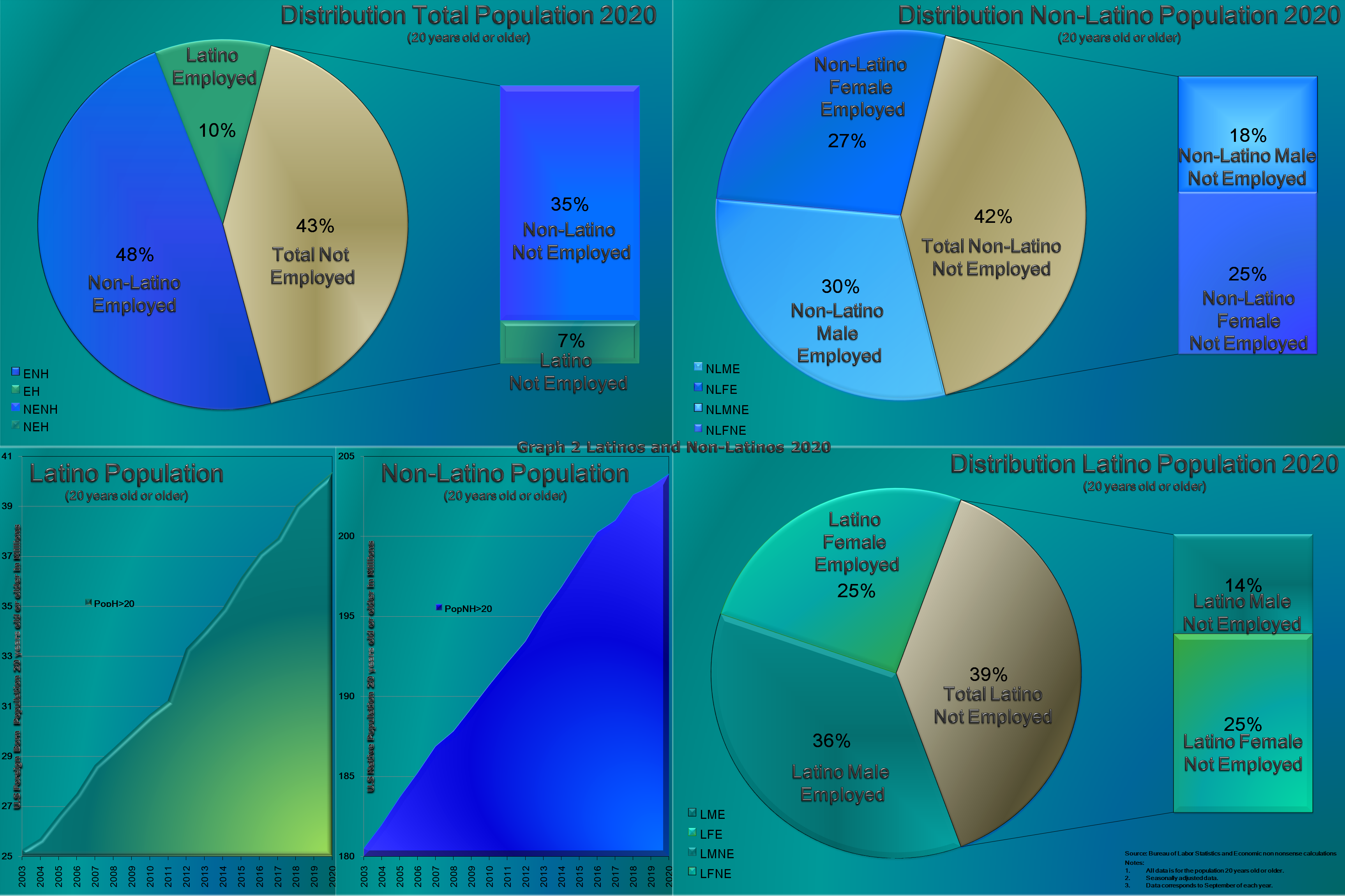 Graph 2 complements Table 2 by representing the employment/unemployment situation in September of 2020 for the population 20 years old or older. The top-left panel corresponds to the entire population cohort, showing that 43% is not employed while of those employed (57%), approximately 10% are Latinos and 48% Non-Latinos. An alternative way to describe the top-left panel is to say that the U.S. population is composed of 10% employed and 7% not-employed Latinos and of 48% employed and 35% not employed Non-Latinos.