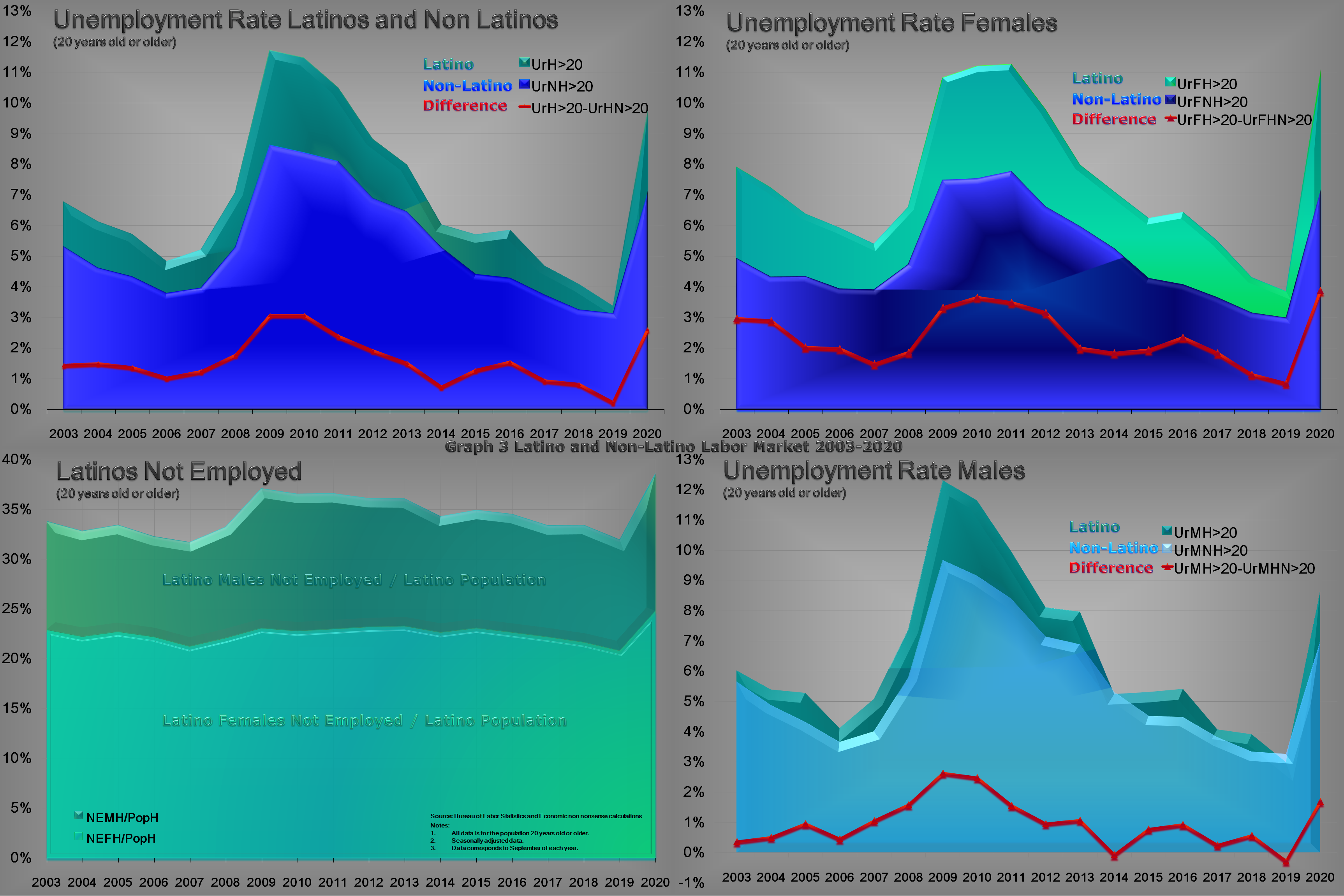The bottom-left panel of Graph 3 plots the total number of not employed Latino males and females as percentage of the total Latino population. May be the most relevant aspect is how September of 2020 reached a record 39% of Latinos not employed, consistent with the observation on Graph 2. The previous record of 37% was achieved due to the Great Recession in 2009. Since that crisis, the percentage of Latinos not employed had been continuously declining until 2019 when it reached 32%.