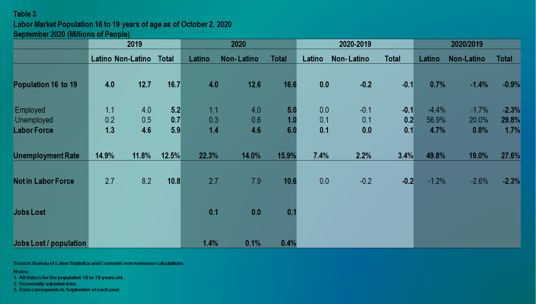 Table 3 by clicking here. Not only is the unemployment rate for Latinos 16 to 19 years old significantly higher than for the Non-Latinos but the phenomena observed earlier of increased burden during bad times for relatively less powerful groups, is also present in here. In fact, while the unemployment rate for the Non-Latino 16 to 19 year old population rose by 14% the one for Latinos did by 22% as depicted on the