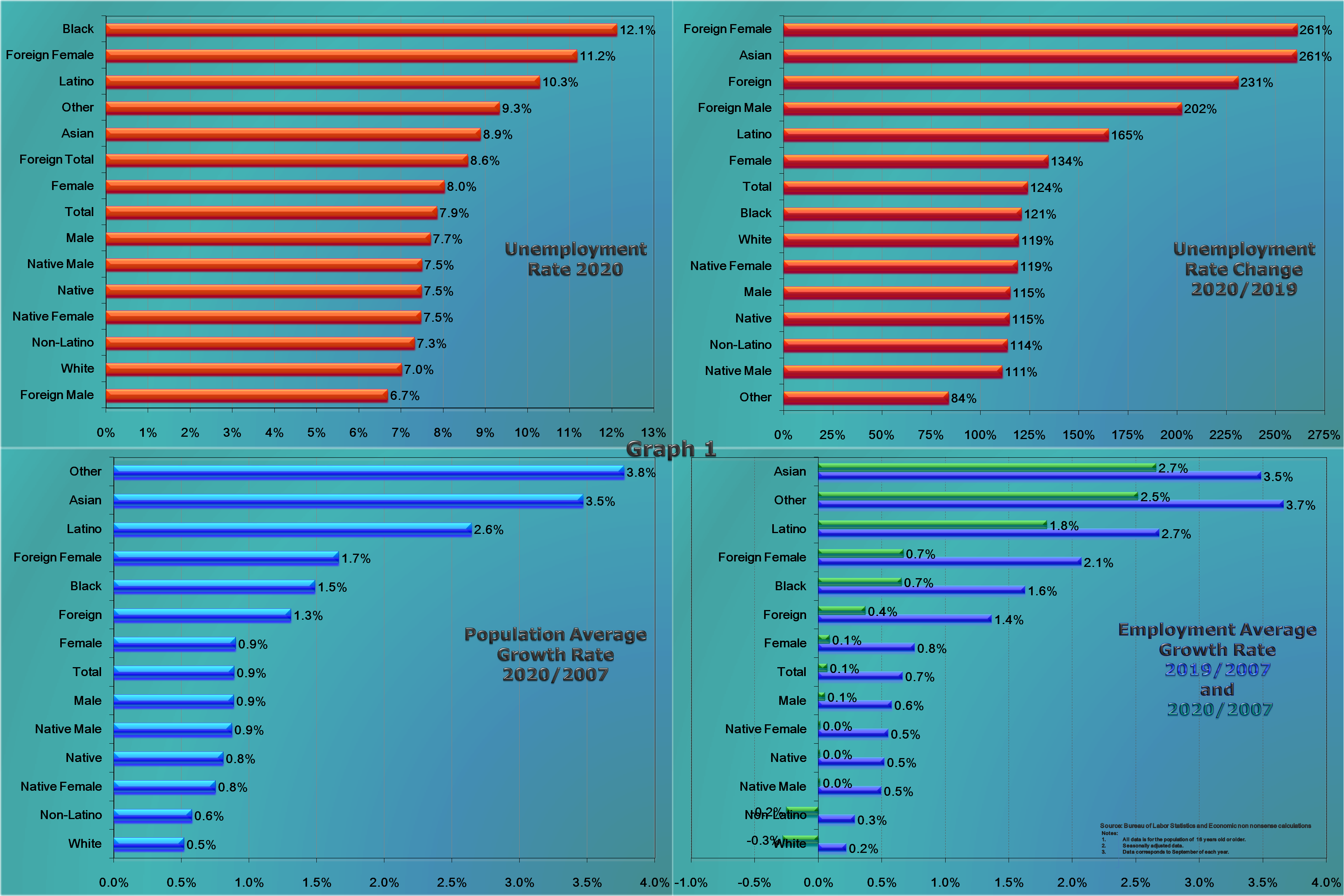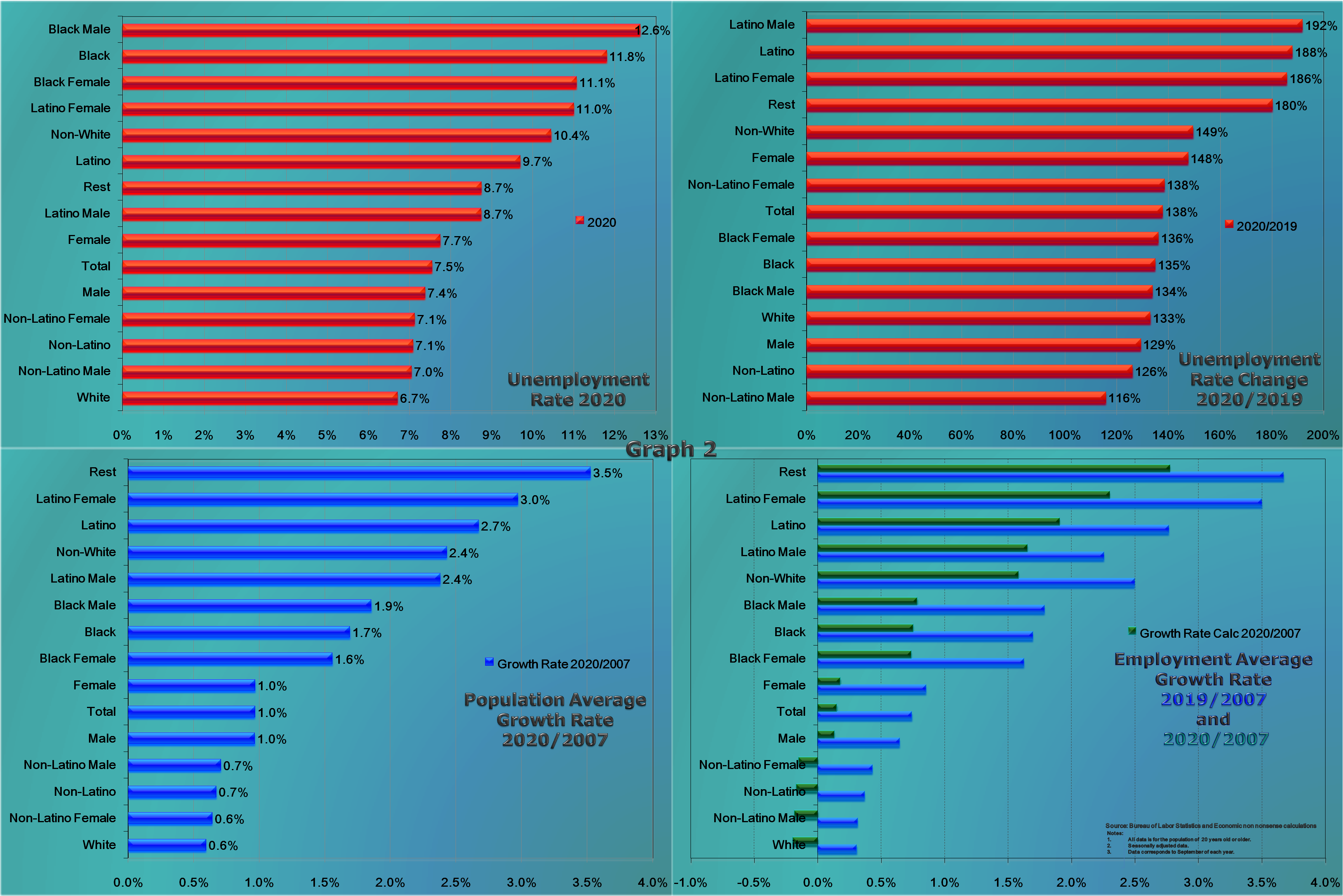 The top-left panel lists the unemployment rate for 15 different segments of the population ranking them from highest to lowest. The graph confirms the intuition, observed throughout the month, concerning the higher unemployment rate for the groups that have been traditionally unable to fully participate on the economy. Thus, the top three highest unemployment rates are observed for the Black, Foreign-Born Female and Latino populations.