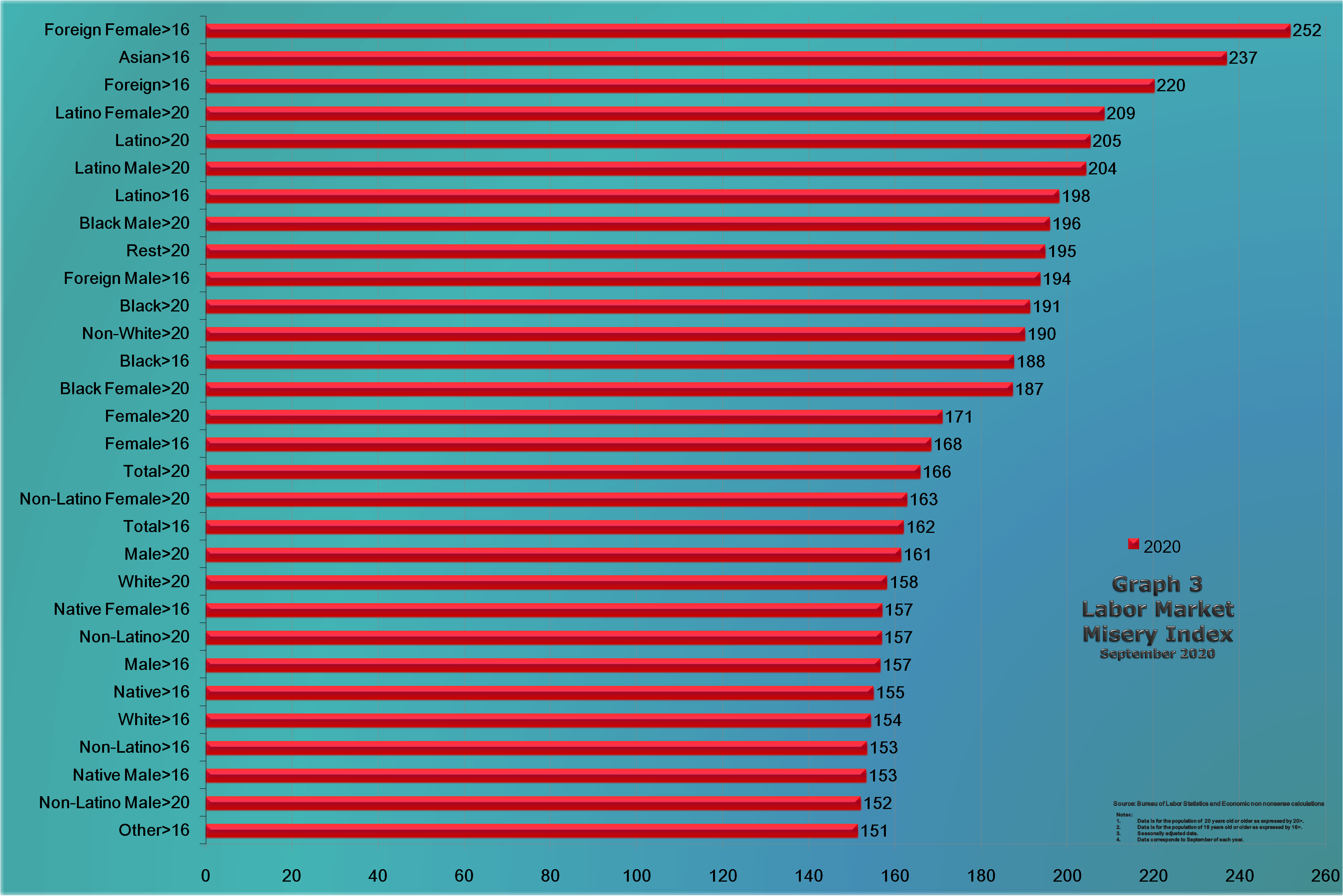 Graph 3 easily confirms the intuitions brought throughout each of the previous October discussions and the current one in the two prior sections. From looking at the Graph the first striking point is that there are practically two groups in the population that tend to be closer together. The first one with, relatively lower levels of suffering starts with the group "Other" 16 years old or older and "Non-Latino Male" 20 years or older and ends with the segment "Female" 20 years old or older. The second, and much more distressed group starts with "Black Female" 20 years old or older, with the lowest index value (187), and ends, at the top of the list, with the largest and worst index for the "Foreign Born Female" 16 years old or older with a value of 252.