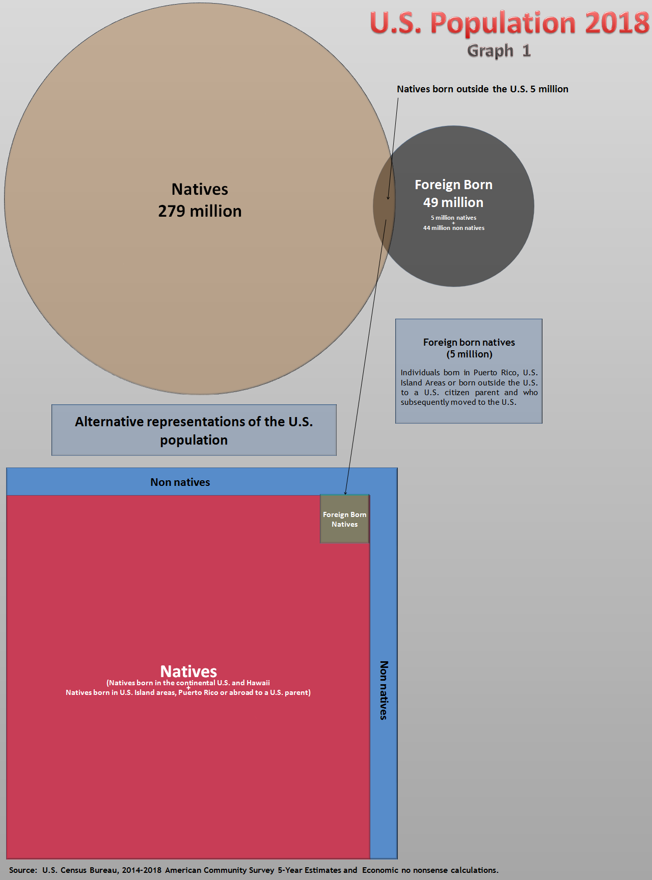 For the U.S. having a diverse and effective non native population represents a competitive advantage. In general, the foreign born individual is a ready mature worker that did not require any local resources for her/his upbringing like housing, food, transportation, health care and education. In effect, the number of foreign born children in the country is relatively small compared to the native. In fact, the population 17 years old or younger represents 23.1% (64.5 million) of the total among the natives and 5.8% (2.5 million) among the foreign born.