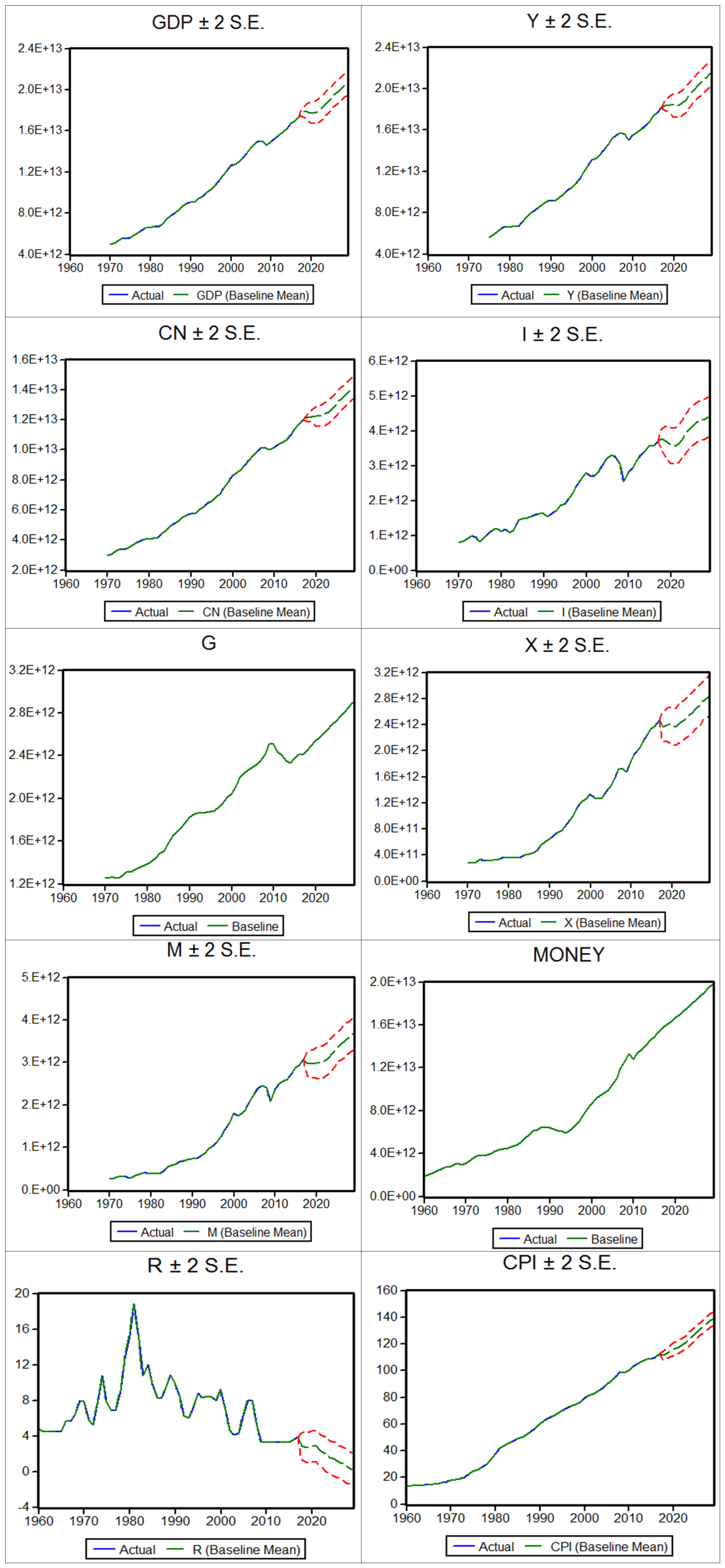 Nonetheless it still gives a good sense of where the economy is going, given the historical data and the model equations. It also suggests the possibility of a GDP contraction starting in 2020 and continuing through 2021. The policy parameters are similar to the ones used in the quarterly model although not strictly comparable since the money supply variable is different. However, it is assumed that that the broad money supply will grow at a real rate of 2% per year between 2020 and 2029. In the case of government expenditures the assumption is also kept at a growth rate of 1.5% per year.
